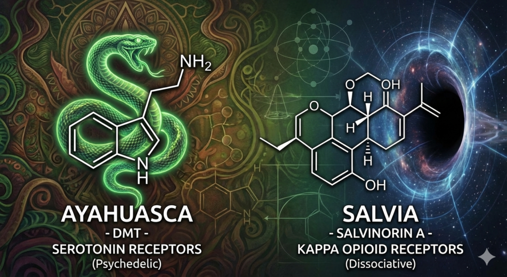 A Sálvia é uma experiência dissociativa e de curta duração, enquanto a Ayahuasca ativa processos endógenos de expansão da consciência, utilizando moléculas que o nosso próprio corpo já produz.
